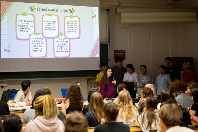 Des étudiants de première année d’études de santé assistent à un cours de tutorat donné par l’Association pour l’accès santé université Paris Cité,le 5 septembre 2024. BENJAMIN GIRETTE POUR « LE MONDE » Au micro,ils dispensent des « tips » à leurs cadets,ces conseils de méthodologie et d’hygiène de vie qui pourront faire la différence au moment de passer les examens pour intégrer l’une des filières santé au sein de l’université Paris Cité.